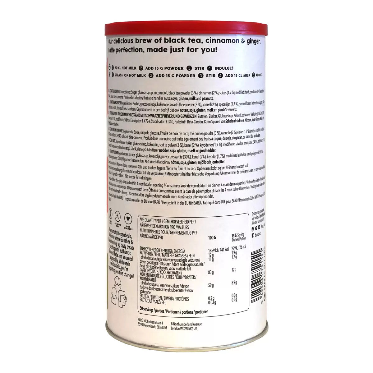 Baru Spiced Chai Latte is a delightfully crafted instant latte with black tea and a blend of aromatic spices, such as cinnamon, ginger, cardamom and cloves. This chai latte is made for those who cherish a moment of pure indulgence. There are no artificial colours or flavours and it is quick and easy to prepare, just stir into hot milk or your favourite plant-based alternative. It's perfect for every season, cosy in the winter and refreshing as an iced chai in the summer.