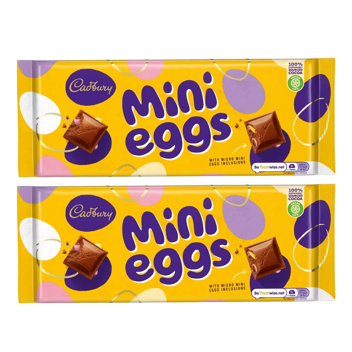 Now enjoy Cadbury Mini Eggs in a chocolate bar form! The Cadburys Mini Eggs Chocolate bar adds a twist on the iconic Cadburys Dairy Milk. Enjoy a delicious milk chocolate bar with Cadbury micro Mini Eggs inclusions.