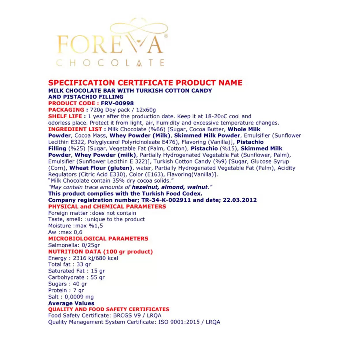 Evadore Angel Hair Chocolate is a delicious milk chocolate bar filled with delicate Turkish cotton candy and rich pistachio filling. This unique blend offers a melt-in-your-mouth sweetness paired with a satisfying nutty taste.