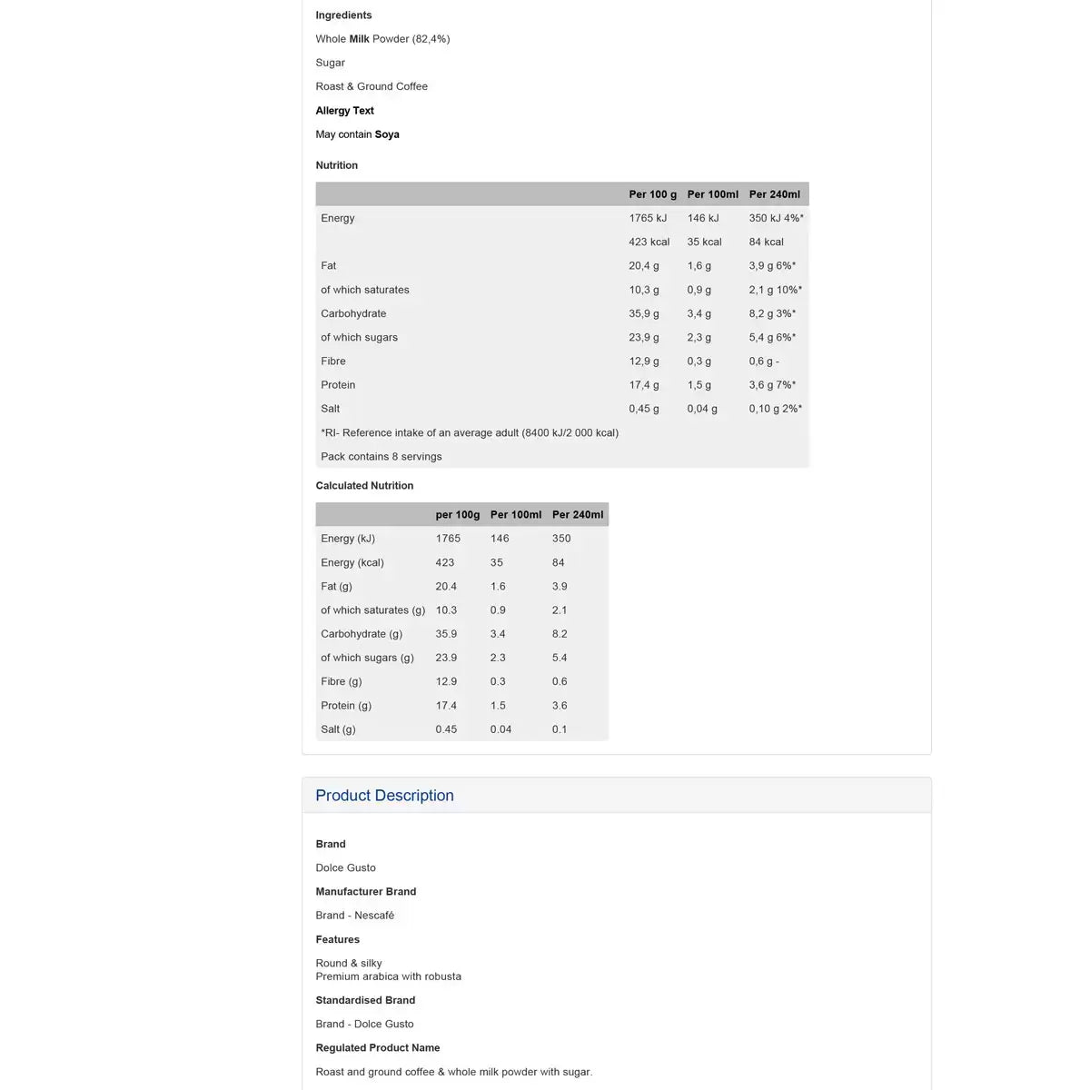 Ingredients: Roast & ground coffee, whole milk powder with sugar