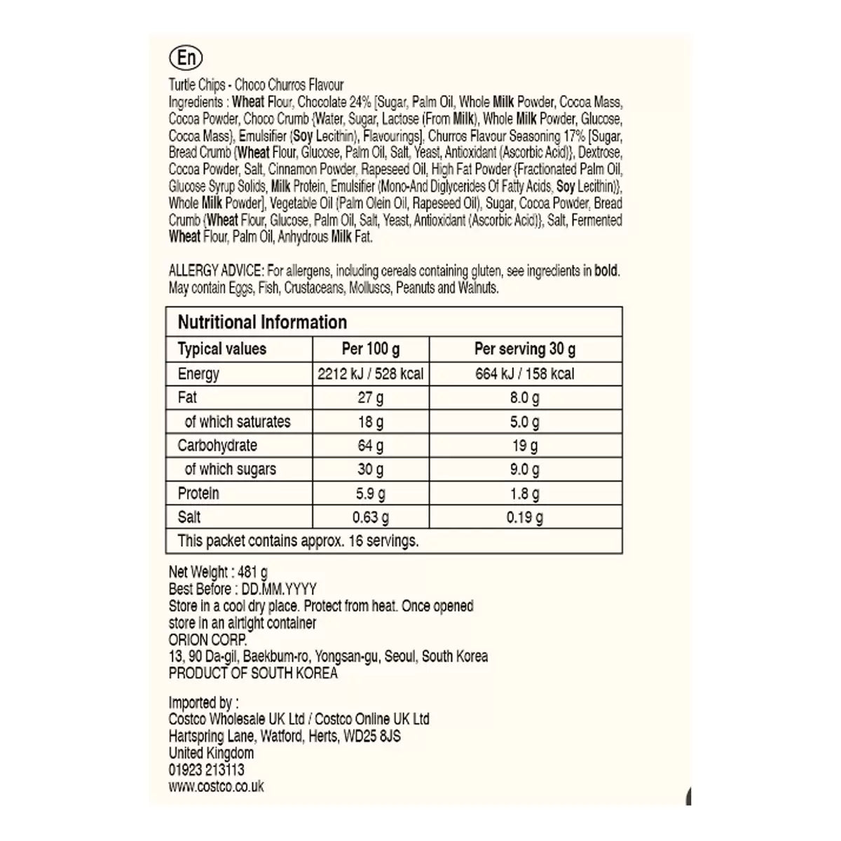 Enjoy Orions Turtle Chips Choco Churros. Characterised by their rich texture and double flavour, these chips have maximum crispiness creating the sensations of eating several chips at once. Share this unique, yummy treat with family and friends. The chocolate and cinnamon flavours combined will leave you wanting more.