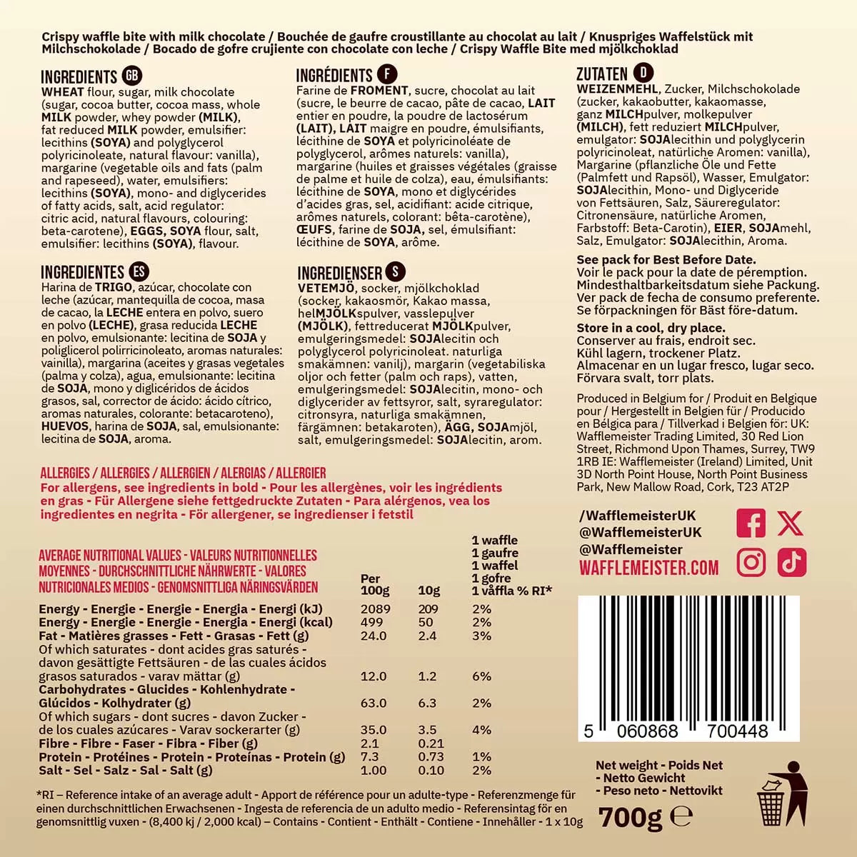Wafflemeister Belgian Chocolate Mini Waffle Bites are crispy waffle bites with milk chocolate. An ideal snack, perfect for every time of day, mood and appetite. Enjoy them on their own or pile them high with gloriously inventive toppings.